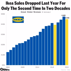 Last year, Ikea sales fell for the second time in 20 years — the only other instance being in 2020, when the pandemic stopped customers from making pilgrimages to Ikea locations to see BILLY bookcases in person and sample the Swedish delights at their in-store restaurants. The 2024 revenue drop came after the world’s largest furniture seller discounted a range of thousands of items at an average rate of 10%, having previously raised prices on pandemic-era supply issues.